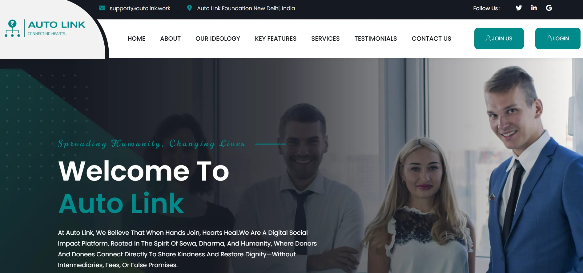 Auto Link positions itself as a volunteer-based system in New Delhi, India. It claims to link donors with those in need. No fees or middlemen, they say. Users sign up, verify, match, and deal directly. The site stresses that they handle no funds. Donations are voluntary. No returns expected.