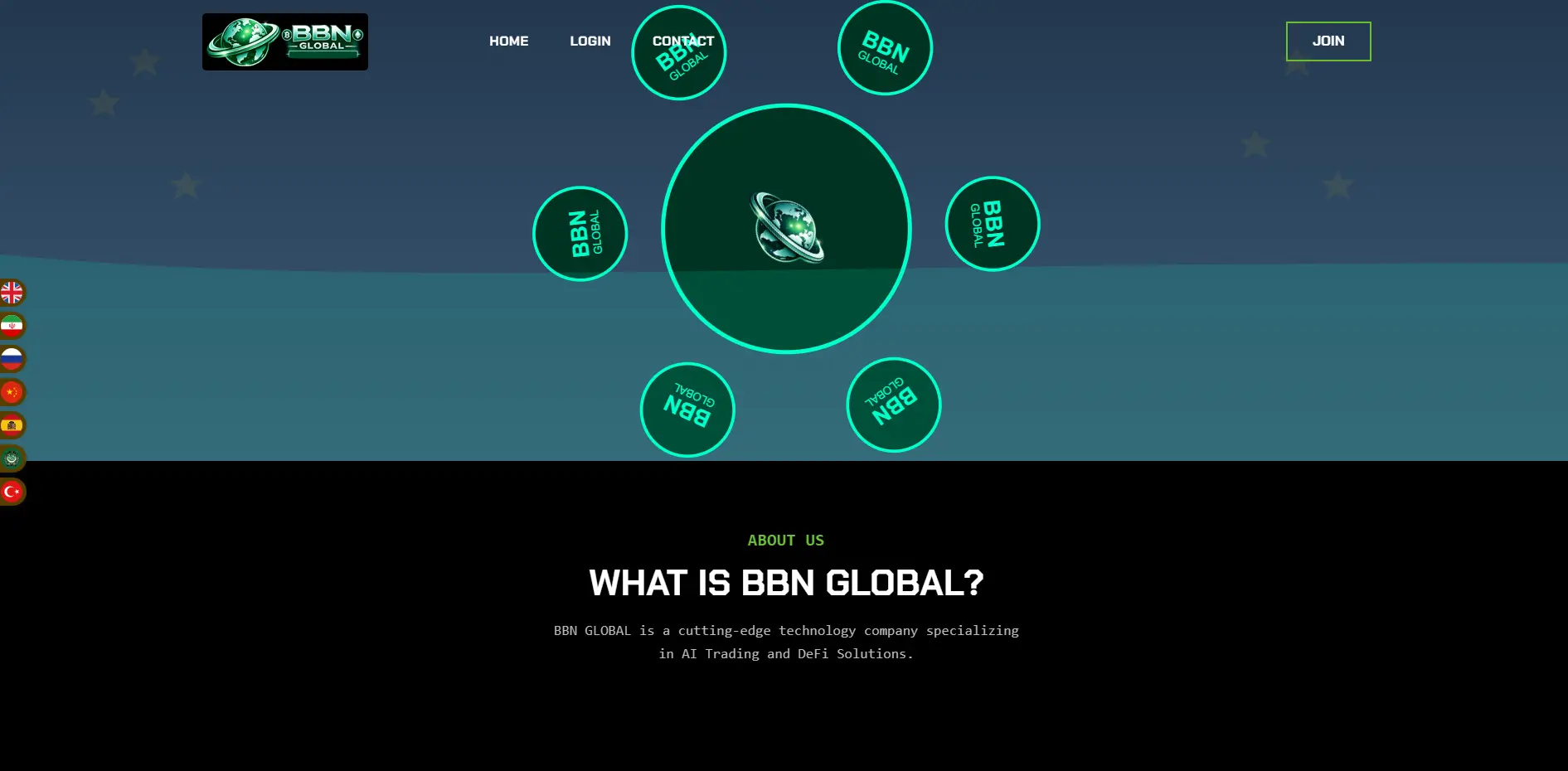 BBN Global describes itself as a technology company focused on AI trading and DeFi solutions. The platform centers on a token called BBN GLOBAL. Users can connect wallets like MetaMask or Trust Wallet to buy, stake, or trade the token on PancakeSwap.