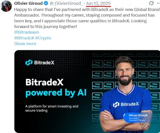 BitradeX operates as a Chinese-origin MLM crypto Ponzi scheme. It gained visibility when French footballer Olivier Giroud was announced as its “Brand Ambassador” in June 2025. The platform promises high returns through crypto trading and recruitment, a classic structure where new investor funds pay earlier participants.