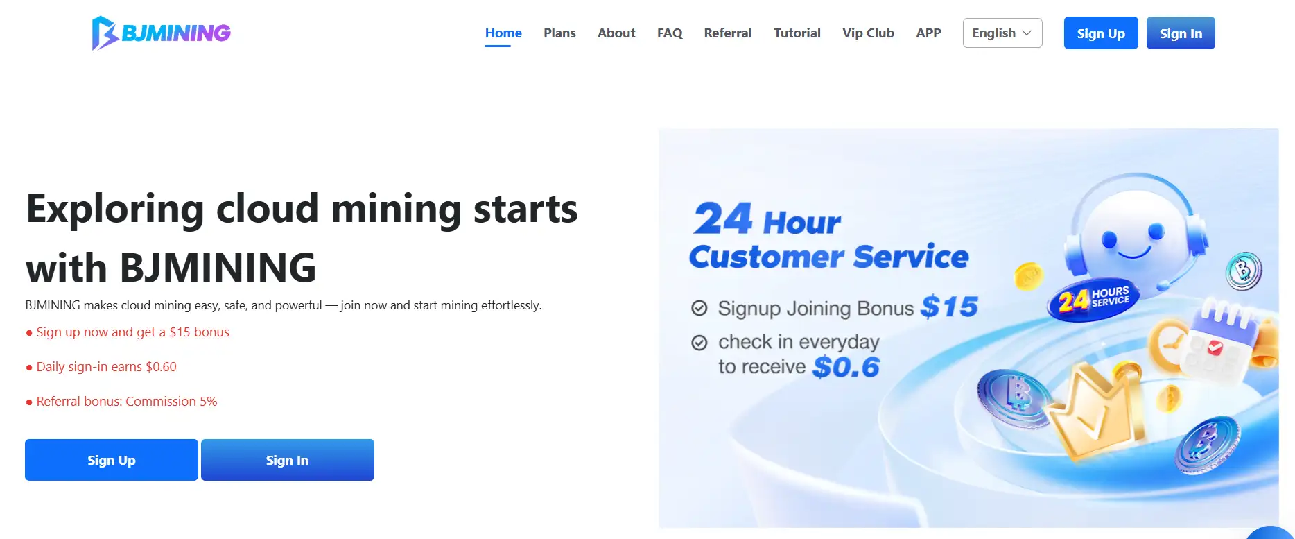 BJ Mining presents itself as a top cloud mining provider offering services for major cryptocurrencies, including Bitcoin, Ethereum, XRP, and Doge. It states that it began operating in 2015 and claims to run its operations from England with a network of more than sixty green-powered mining farms using solar and wind energy. The company further promotes having over one point two million ASIC machines and more than five million registered users across one hundred eighty countries. It highlights features such as a mobile application for easy access, daily sign-in rewards of close to sixty cents, and a fifteen-dollar welcome bonus for new members. The platform also promotes the use of AI-based mining technology designed to improve efficiency without requiring users to set up any physical hardware.