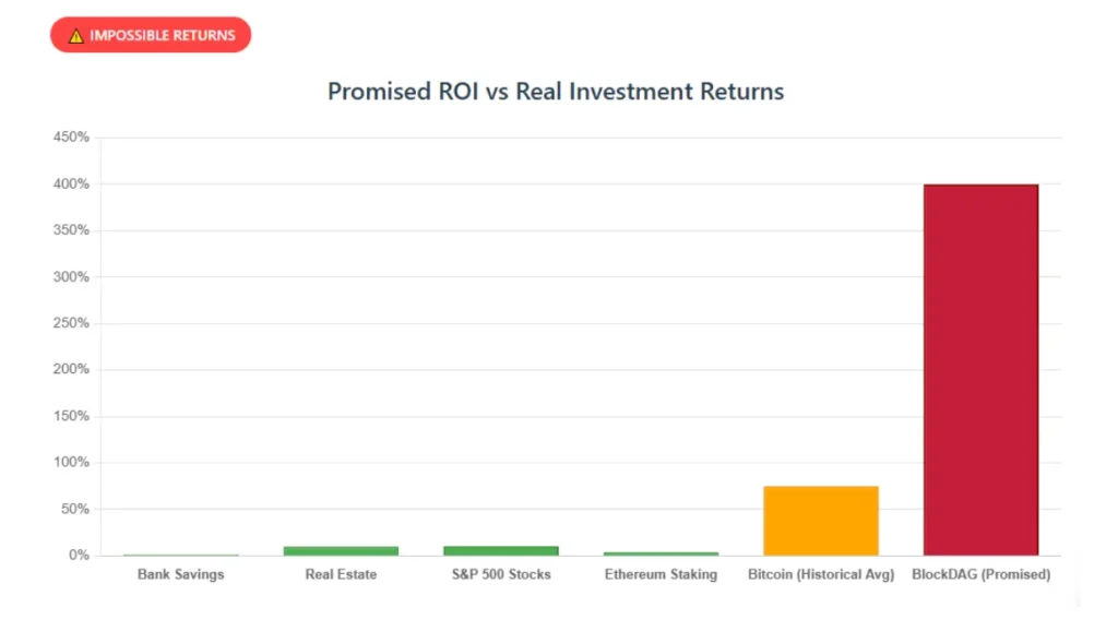 BlockDAG touts 400%+ ROI, which is far above bank (4 - 5 %) or real estate (4 -10 %) returns; such high claims are risky.