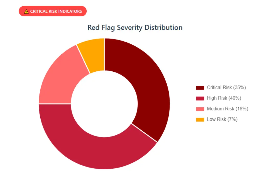 Key red flags include low web traffic, negative user feedback, possible phishing risks, undisclosed ownership, vague hosting details, and weak SSL protection.