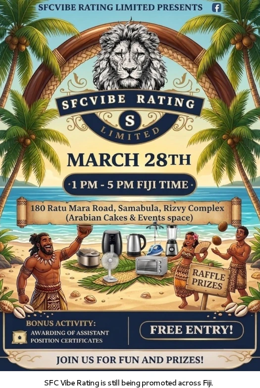 The Consumer Council of Fiji has issued multiple public warnings against SFC Vibe Rating Limited, describing it as a sophisticated task-based pyramid scheme designed to defraud Fijians. On March 10, 2026, the Council reiterated concerns that the platform continues to lure thousands despite earlier alerts, per official press releases. CEO Seema Shandil emphasized that legitimate opportunities do not require upfront payments, and the scheme bears all hallmarks of fraud similar to the 2023 eBayShop scam that caused over $3 million in losses, per.