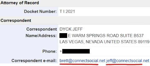 The application lists Dyck as the only correspondent. There are two Connect Social email accounts listed as contact details, one of which seems to be Brett Nicholson’s.