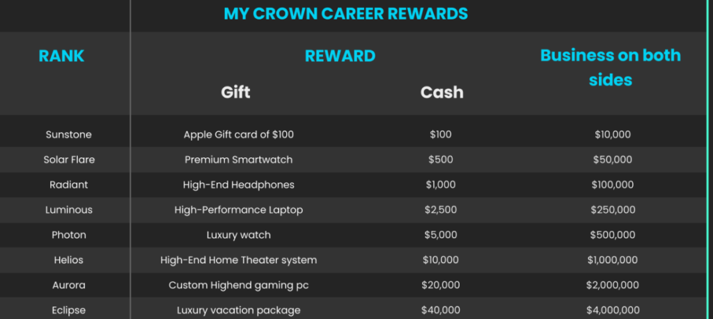 Crown Bankers uses a binary compensation mechanism to pay residual commissions.