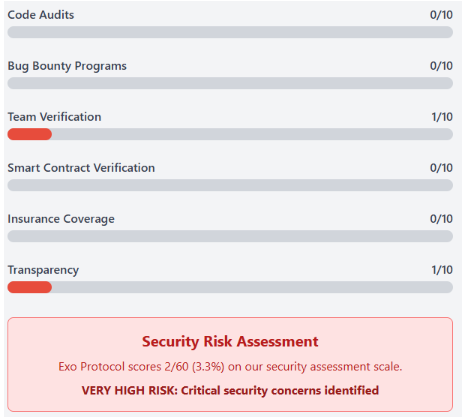 Security represents a fundamental component of legitimate cryptocurrency platforms. Our investigation into Exo Protocol’s security measures reveals significant gaps: