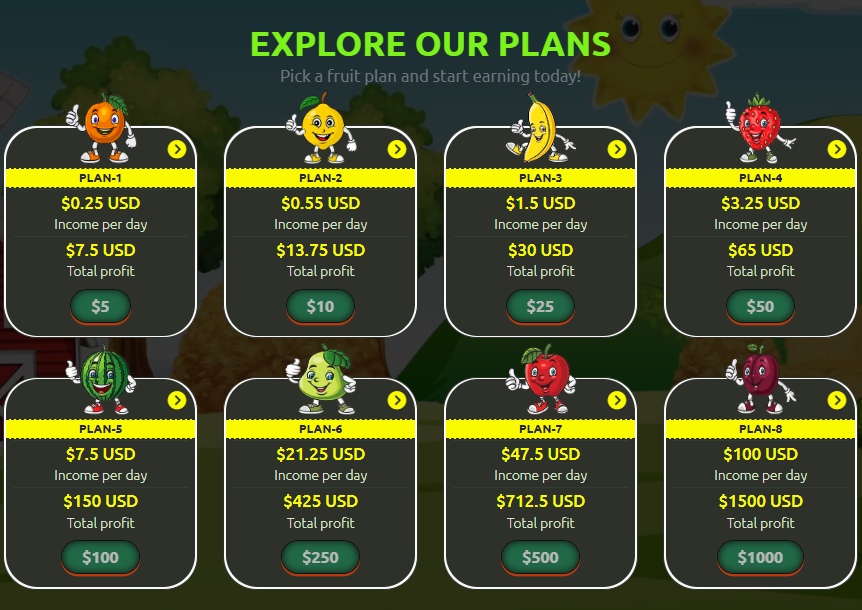 GreenFarm.lol offers investment plans with daily returns ranging from 5% to 10%. Here’s a breakdown of the plans: