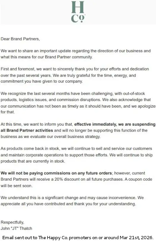 On or around March 21, 2026, The Happy Co. suddenly suspended all Brand Partner (MLM) activities, announcing it would no longer pay commissions on future orders while it “evaluates its overall business strategy.” The company also removed its MLM-focused website and shifted to a standard retail model, with its “About Us” section now lacking ownership or executive details.