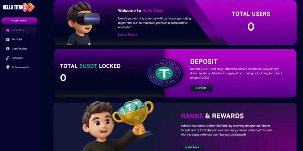 Hello Titans promises 0.5% daily returns, equating to 15% monthly or 180% annually. This far exceeds traditional investments.