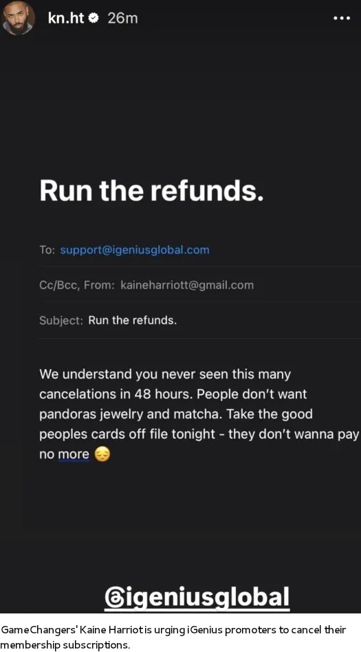 Former iGenius promoter Kaine Harriott (GameChangers) urged members to cancel subscriptions around December 18, claiming iGenius is rebranding to “Connective”, per. Harriott promotes Go AI Academy, run by GameChangers founder Rakan Khalifa, offering matching packages (Select to Connect, Elite to Complete) without enrollment fees for ex-iGenius members. Go AI Academy lacks a public website, operating on a secret platform with AI-powered trading and investment assistance, echoing iGenius’ Cforce auto-trading.