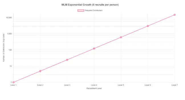 MLMs inherently rely on continuous recruitment, creating an unsustainable geometric progression: This model demonstrates why MLM recruitment quickly becomes unsustainable. If each distributor recruits just 5 people, by level 10 you would need over 9.7 million distributors – far exceeding what’s possible in most markets.