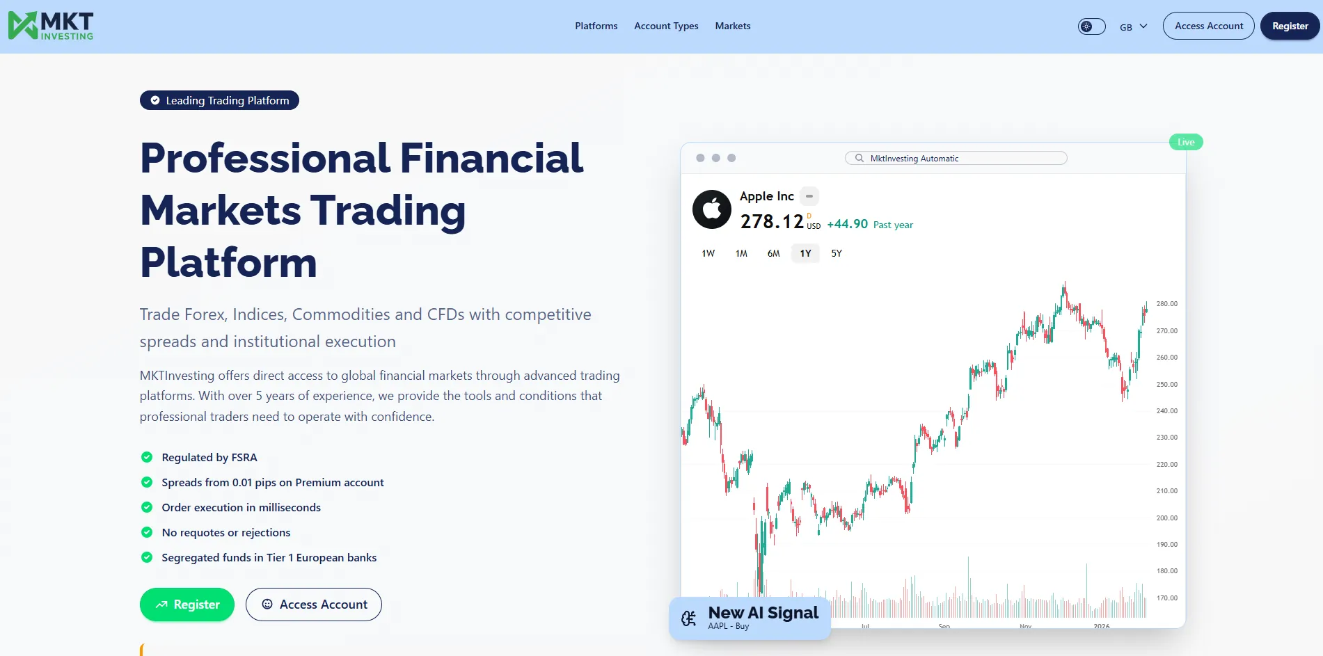 MktInvesting markets itself as an established CFD broker with tools for trading Forex pairs, stock indices, commodities, cryptocurrencies, and shares. The site highlights features such as:
