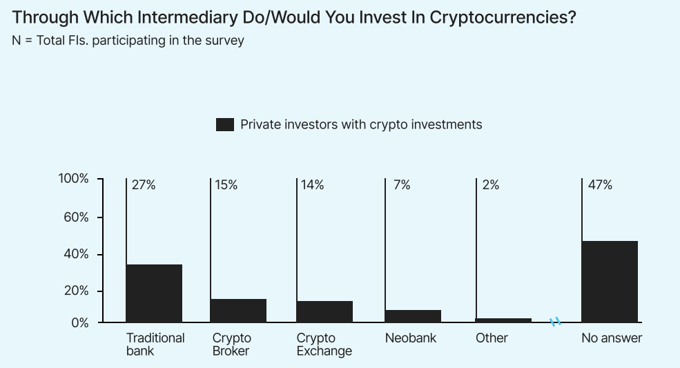 Given that 27% of study participants would rather invest in cryptocurrencies via a regular bank and just 14% would choose a crypto exchange, more bank-sponsored cryptocurrency products might boost the adoption of cryptocurrencies in Europe.