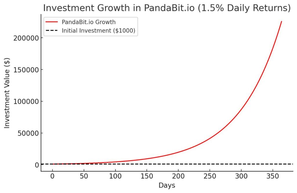 This graph demonstrates the exponential growth of a $1,000 investment in PandaBit.io under its claimed 1.5% daily return: