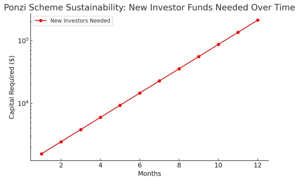 This chart highlights how Ponzi schemes require an ever-increasing amount of new investor funds to sustain payouts:
