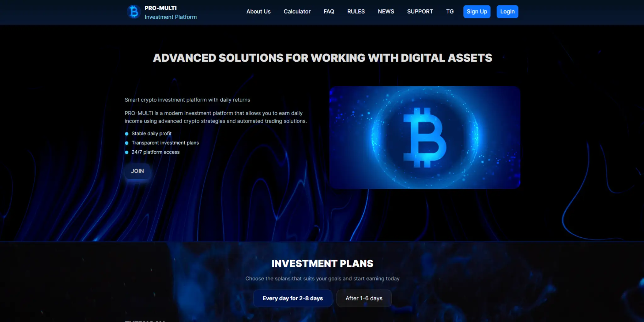Pro-Multi positions itself as a professional multi-asset digital platform. It claims to use advanced crypto strategies and automated trading solutions. The site offers investment options with stable daily profits. Yet, a closer look shows red flags.