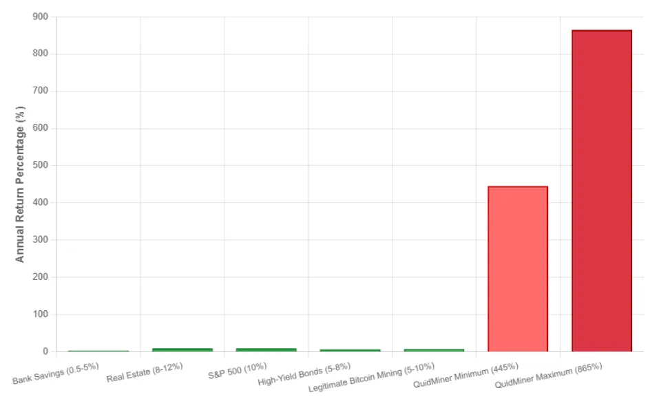 Graph idea: Bar chart shows bank ROI at 3%, real estate 7%, staking 10%, vs Quid Miner 865%. The gap proves unsustainability.