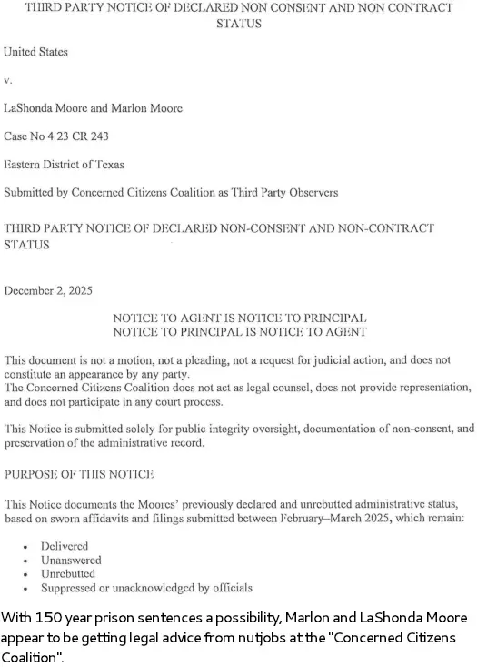 LaShonda Moore rejected pro se status and counsel on December 2, 2025, claiming no consent to “judicial contract,” per. During a December 9 Faretta/Frye hearing, she provided nonresponsive answers, asserting presence “under duress,” per. Marlon Moore refused consultations post-initial meetings, with responses suggesting belief in a “legal system that does not exist,” per. Standby counsel noted rational early discourse but recent incoherence, per. A Concerned Citizens Coalition (CLC) letter, filed December 2, repeated sovereign claims, ignored by the court. CLC’s Facebook (created December 1) and domain (concernedcoalition.org, registered November 25) suggest recent formation.