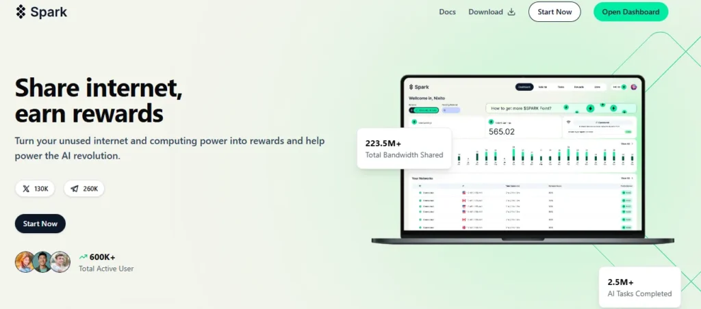 SparkChain AI builds a decentralized AI data network. Users run Spark Lite (browser-based) or full nodes (desktop) to share unused bandwidth. This supports AI training data networks. Participants earn Spark Points, later convertible to $SPARK tokens on the Solana blockchain. The platform claims a “Sovereign Data Rollup” ensures AI data provenance using zero-knowledge proofs (ZKPs). Yet, technical details are vague, and no full audits exist.