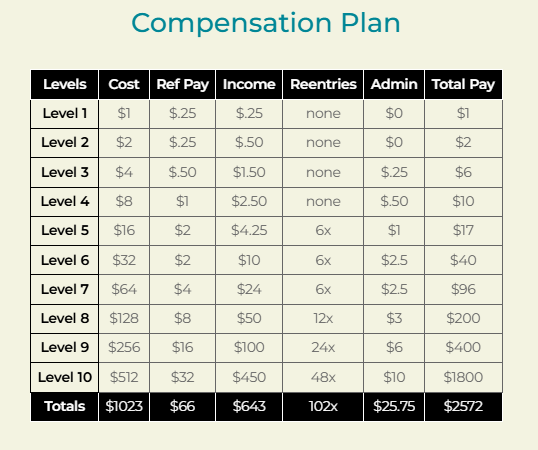 The Super Matrix affiliates buy $1 spots in a 2×2 matrix cycler with 10 tiers.