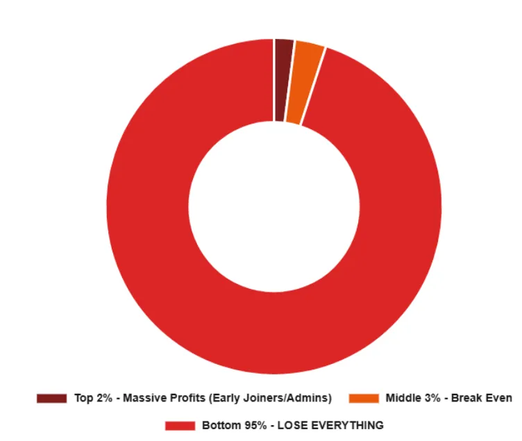 Hidden ownership, recruitment-only income, and potential collapse when sign-ups slow.