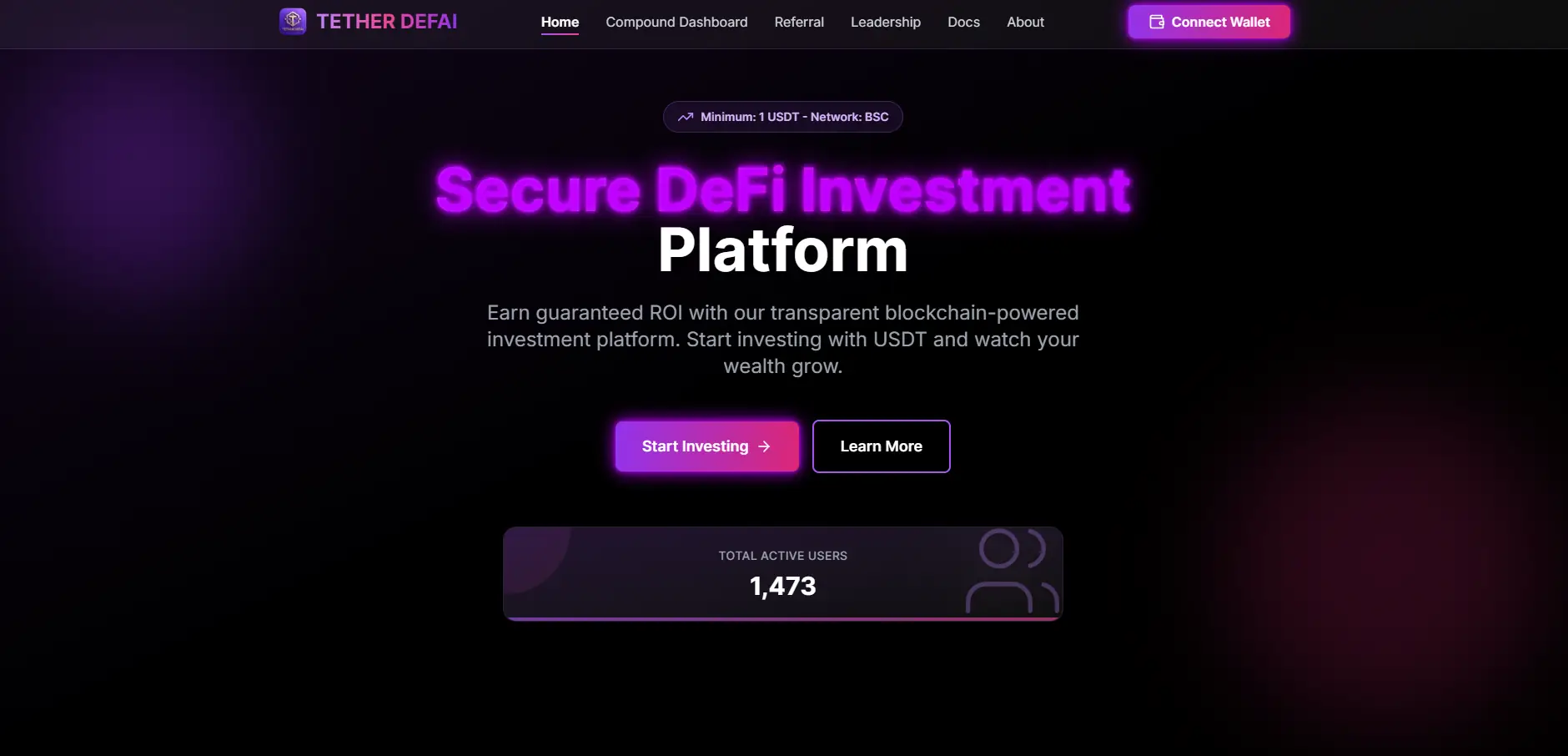 Tether DeFAI uses a unilevel MLM structure. It focuses on recruitment for rewards. Deposits start at 1 USDT on Binance Smart Chain.