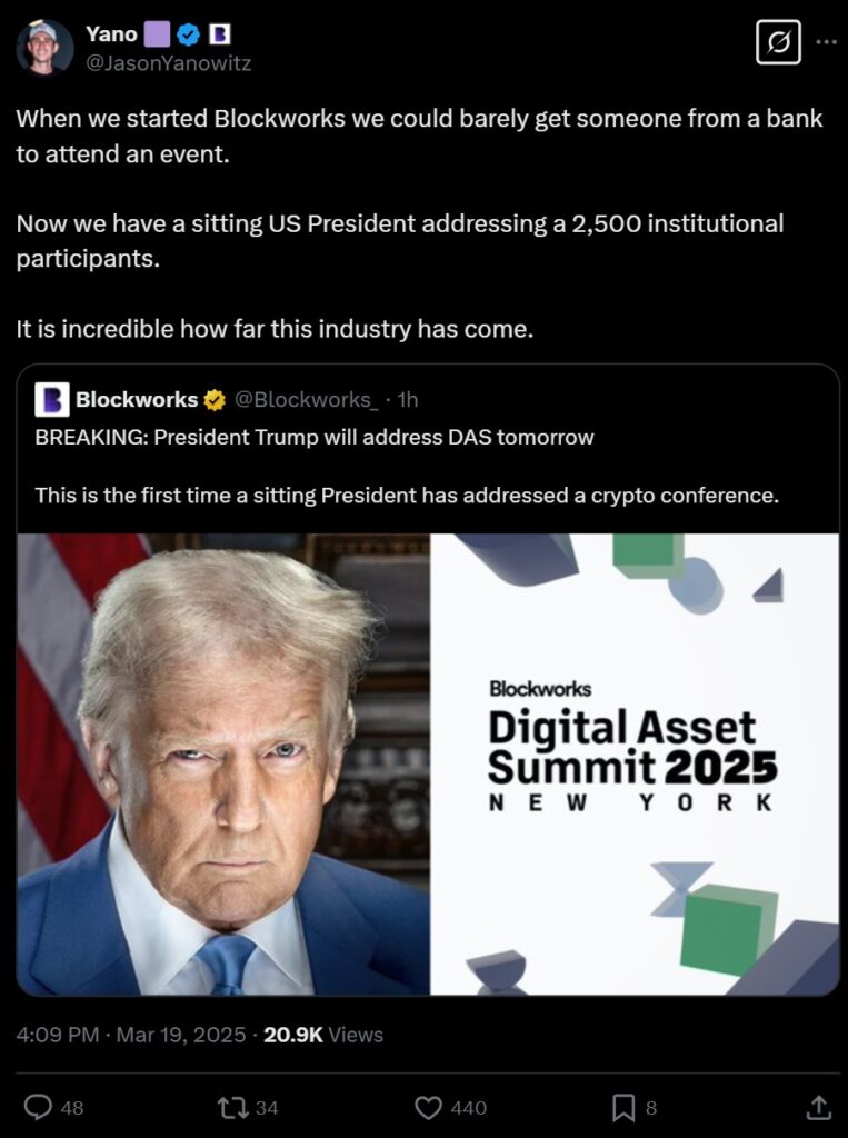 One of Blockworks’ co-founders, Jason Yanowitz, stated in a post on the X platform on March 19 that “when we started Blockworks, we could barely get someone from a bank to attend an event.”