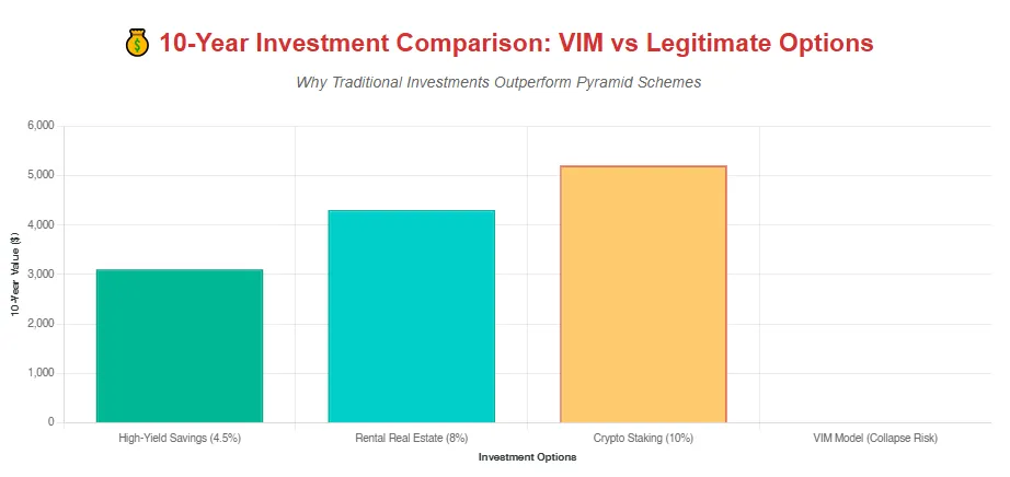 Banks offer a steady 3.9-5% APY. REITs hit 6-10% long-term. Crypto promos reach 10-13% briefly. VIM’s model can’t match without recruitment bubbles.
