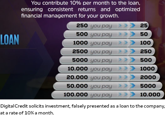 DigitalCredit has divided investment amounts into 10% monthly increments, perhaps out of caution about requiring upfront payments from new Ponzi victims: